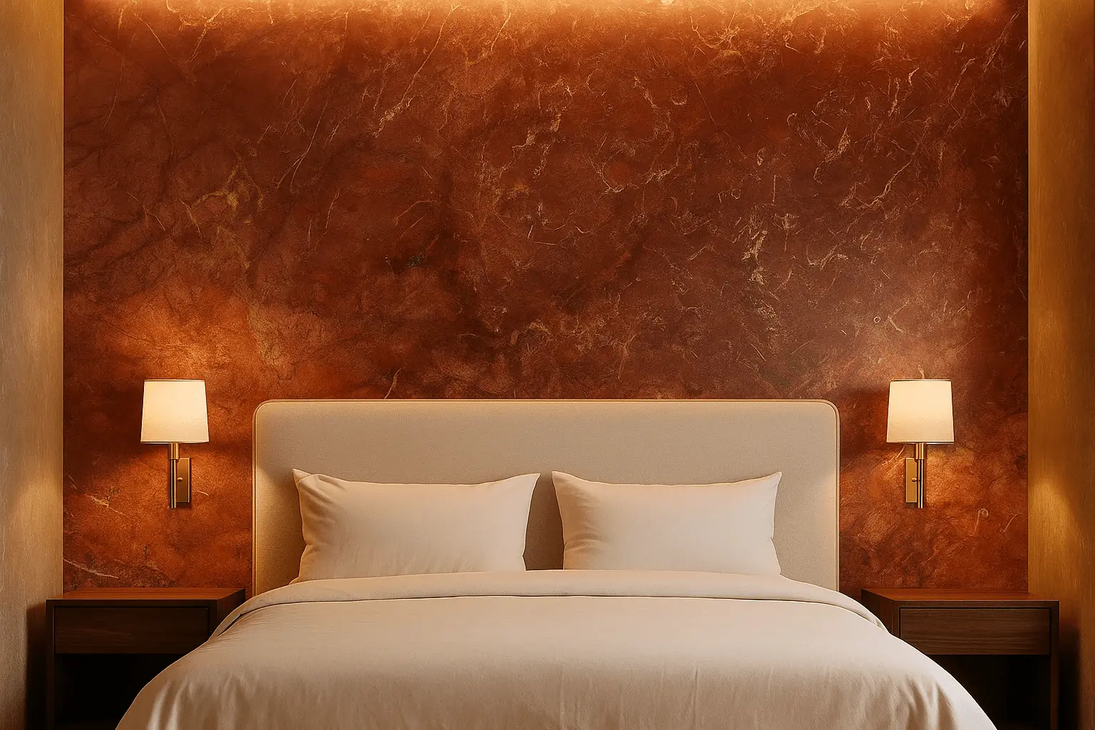 Its combination with gold, cream and natural wood creates a luxurious and harmonious space.